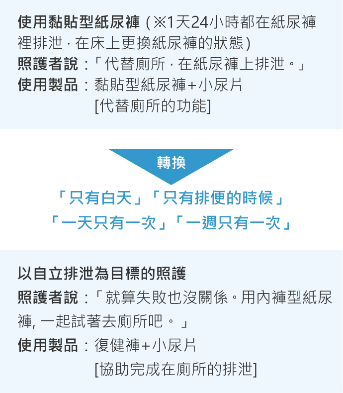 若要在家裡進行排泄照護,UniCharm排泄照護研究所建議不要使用黏貼型紙尿褲,而是使用內褲型紙尿褲。不要讓被照護者1天24小時都在黏貼型紙尿褲裡排泄,而是即使只有白天也好、即使只是排便也好、10次裡面只有1次也好,盡量離床去廁所排泄,作為日常的復健。因此,希望能活用復健褲等內褲型紙尿褲,在離床如廁的過程也不必擔心外漏,以誘導被照護者去廁所為目標。如果能去廁所了,生活或是活動的範圍也會大幅擴大。穿上內褲型紙尿褲離床一小步,就是促進在廁所自立排泄的一大步。也會帶給照護者與被照護者勇氣,恢復正常的生活與社交。