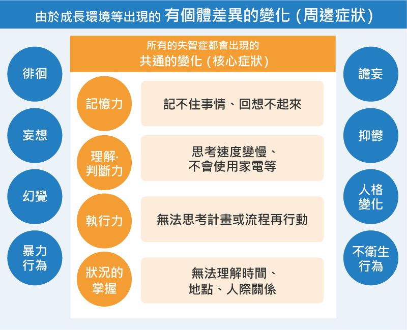註)周邊症狀稱為BPSD(Behavior and Psychological Symptoms of Dementia),中文譯為「失智症之精神行為症狀」