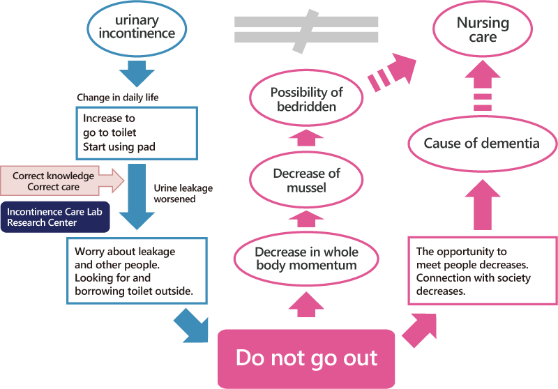 If the incontinence worsens, it means even more trips to the bathroom, constantly looking for restrooms outside the home, needing to frequently use the restroom at other people’s homes, and so on—all of which causes psychological stress that can make people avoid going out entirely. This means fewer opportunities to meet people and more time spent at home, which in turn means less physical movement and decreased muscle mass. If the trend continues, the person could even end up needing nursing care.